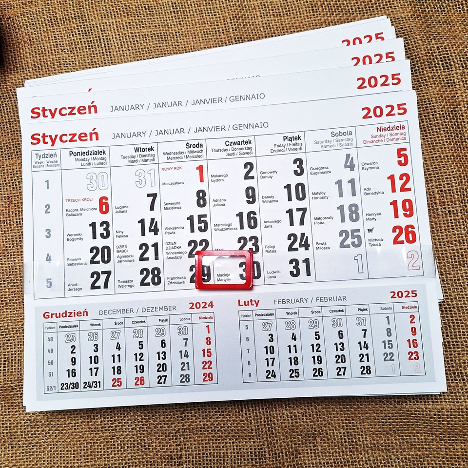 Kalendarze są po polsku, z oznaczeniem polskich świąt.