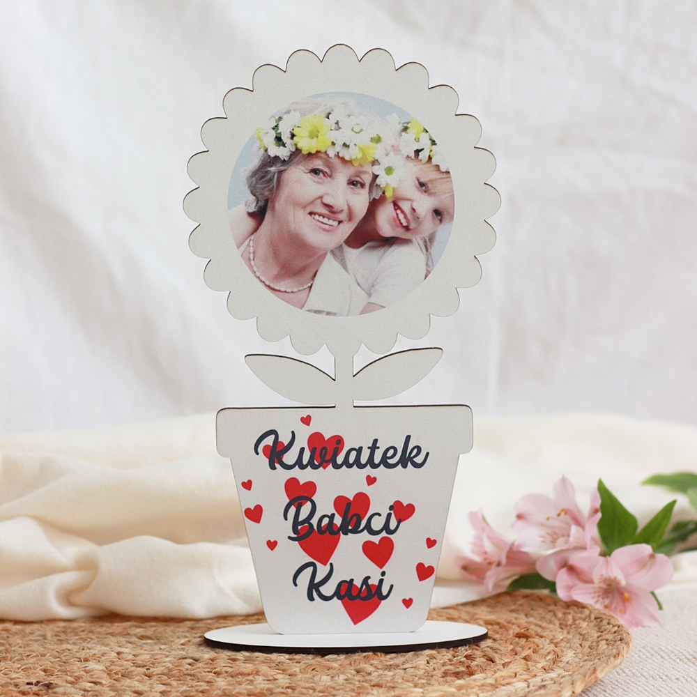 Kwiatek na Dzień Babci i Dziadka z nadrukowanym zdjęciem.