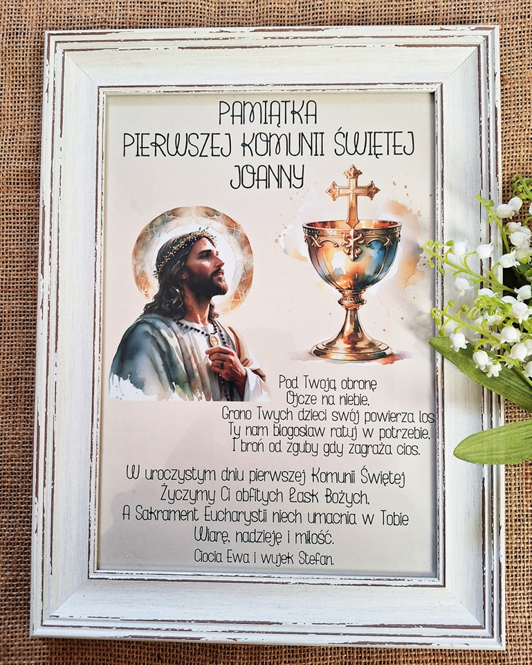 Cudowna i jedyna w swoim rodzaju ramka z Panem Jezusem i kielichem – pamiątka Pierwszej Komunii Świętej.