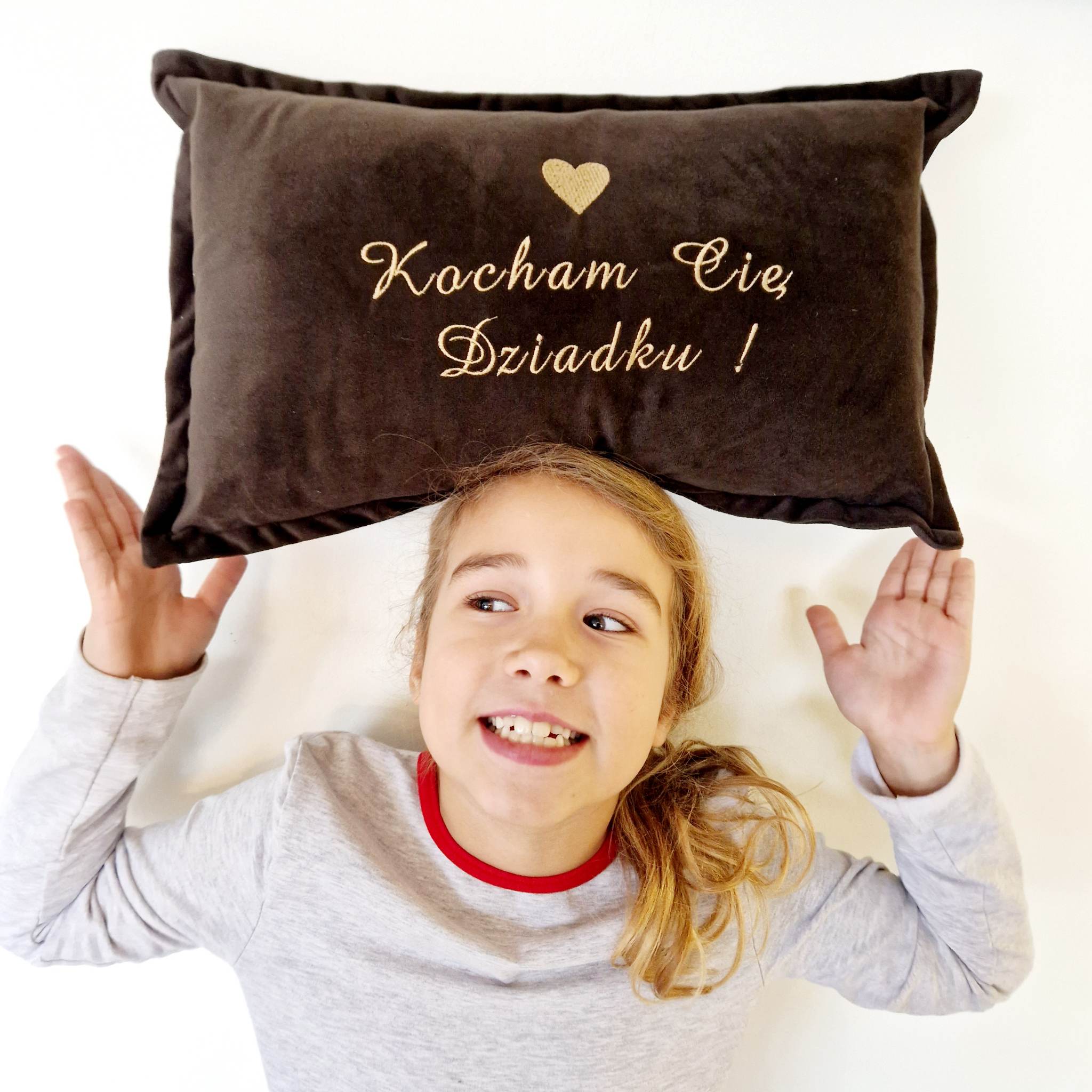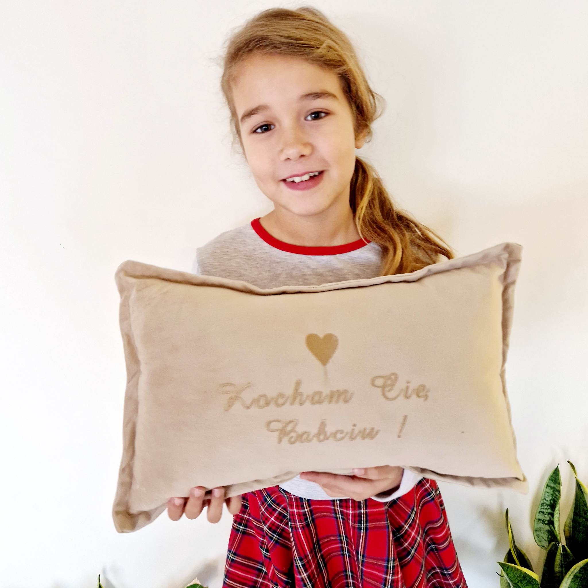 Poduszka wałek na Dzień Babci i Dziadka o wymiarach około 40 cm na 20 cm.