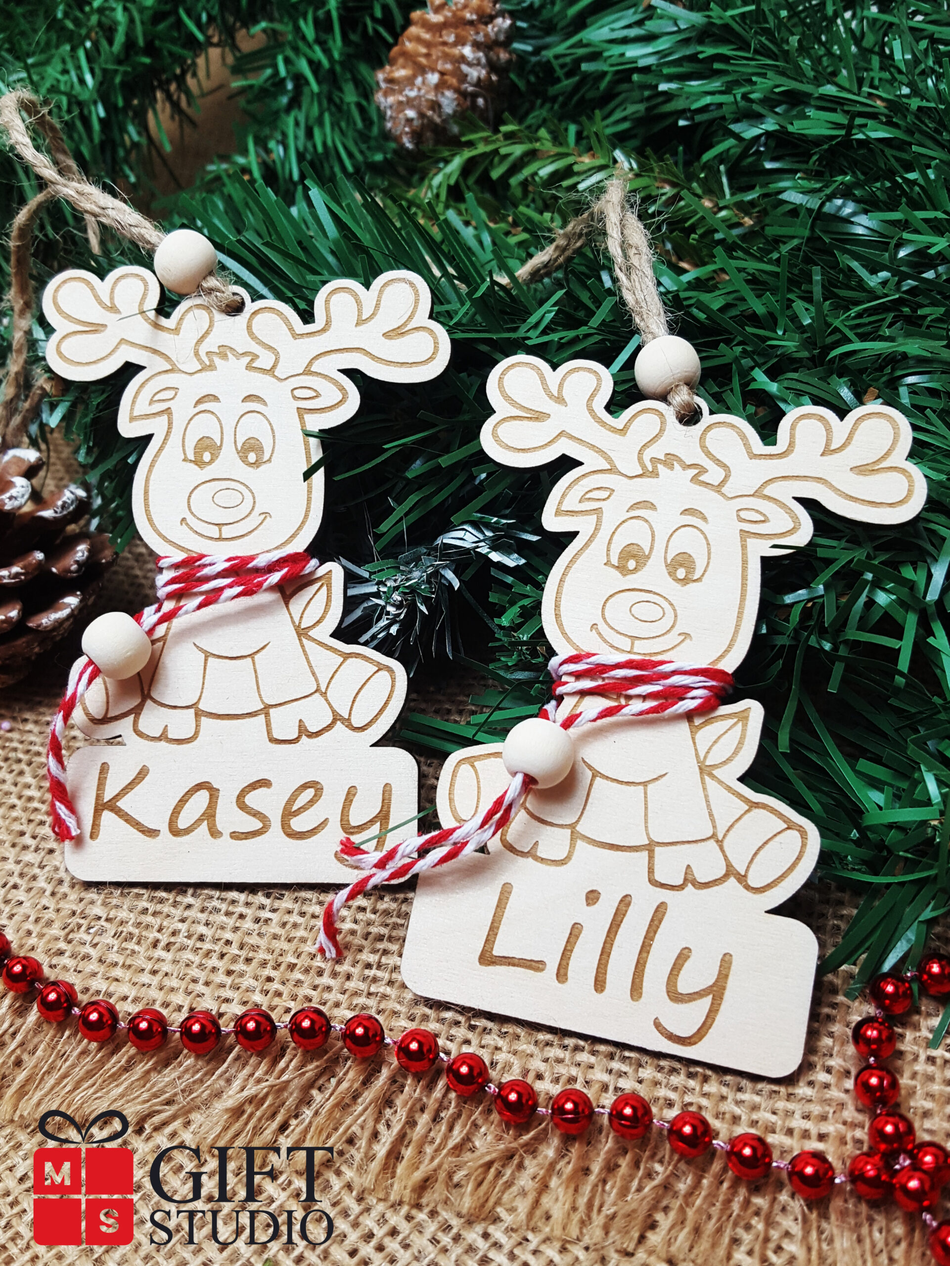 Personalizowana drewniana zawieszka w kształcie renifera – dekoracja choinki.
